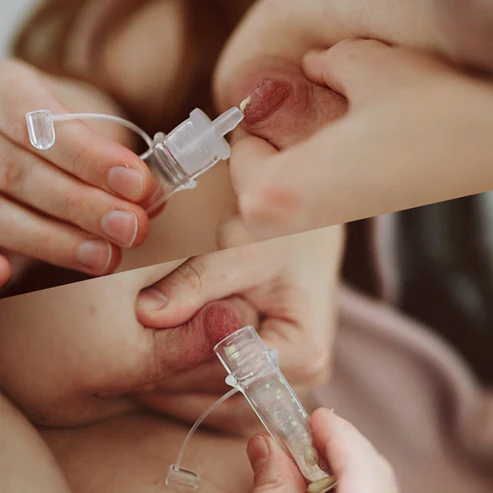 - La succión de la punta del calostro del pezón también puede retirarse para expresarse directamente en el colector.